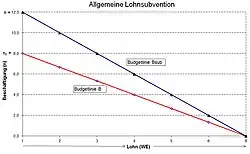 Es ergibt sich eine Verschiebung der Budgetgeraden von B nach Bsub. Die marginale Lohnsubvention setzt am Punkt G0 an und schafft im Modell vier neue Beschäftigte (n0 < n). Die fiskalischen Wohlfahrtseffekte ergeben sich wegen der nachfragewirksamen Outputeffekte für Nicholas Kaldor insbesondere bei allgemeinen (nicht selektiven) Lohnsubventionen. Allerdings ist bei einer selektiven Lohnsubvention die Transfersumme geringer. Einkommenseffekte werden als makroökonomisches Steuerungsinstrument betrachtet, denn zusätzliches Einkommen der Haushalte fließt aufgrund der geringen Sparquote direkt in die Konsumnachfrage. Aufgrund der Konsumfunktion wirken Lohnsubventionen somit als automatischer Stabilisator, denn sie glätten die Konjunkturschwankungen. Zwischen Nachfrage und Beschäftigung ergibt sich eine positive Rückkopplungsschleife, die sich nach jedem Durchlauf abgeschwächt fortsetzt. Lohnsenkungen dagegen drücken auf die Nachfrage und die Preise, schmälern damit die Gewinnaussichten. Die Idee der Lohnsubventionen ist, dass sich selbst bei geringer Arbeitsnachfrageelastizität positive Wohlfahrtswirkungen nachweisen lassen.