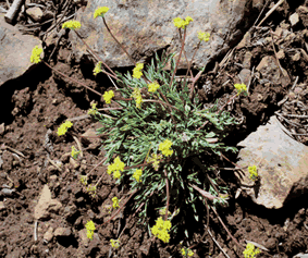 Die Blütezeit liegt im Juli und August, wenn in den hoch gelegenen Lebensräumen der Schnee geschmolzen ist.[4] Der Blütenstand entspringt einem nur wenige Zentimeter hohen Stängel.[4] Es handelt sich um eine Doppeldolde aus winzigen (hell-)[7]gelben Blüten.[4] Diese hat nur einen Durchmesser von 0,5 bis 1,2 Zentimetern, die Strahlen sind 1 bis 3,[7] selten bis zu 6 Millimeter lang.[3] Es gibt wenige schmale Hüllblättchen.[7]