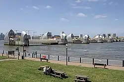 Die Themse war in früheren Zeiten wesentlich breiter und seichter als heute. Sie wird heute fast gänzlich durch Dämme begrenzt und die meisten der rund 15 Zuflüsse fließen unterirdisch.[10] Die Gezeiten der Nordsee machen sich in London noch deutlich bemerkbar, die Stadt ist deshalb durch Überschwemmungen und Sturmfluten gefährdet. Bei Woolwich – östlich von Greenwich gelegen – wurde in den 1970er-Jahren die Thames Barrier gebaut, um diese Gefahr einzudämmen.