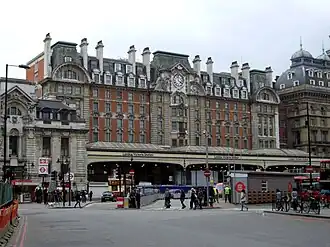 Der Bahnhof entstand in zwei Teilen. Am 1. Oktober 1860 wurde der westliche Bahnhofsteil der LB&SCR eröffnet, der sechs Bahnsteige, zehn Gleise und das Hotel Grosvenor mit 300 Zimmern umfasste. 1898 ließ die LB&SCR ihren Bahnhofsteil abreißen und durch ein größeres Ziegelsteingebäude im Neorenaissance-Stil ersetzen. Die Arbeiten, die den Umbau des Hotels umfassten, waren 1908 abgeschlossen.[8] Am 1. Dezember 1909 nahm die LB&SCR den elektrischen Betrieb auf der Strecke nach London Bridge auf, dabei verwendete sie Oberleitungen.[9]