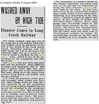 In der Nacht vom 21. auf den 22. August 1903 wurde das gesamte Gleisbett, die Schwellen und die Schienen durch eine ungewöhnlich hohe Springflut weggespült. Es handelte sich dabei um den höchsten bis dahin aufgezeichneten Wasserstand. Mit der gewonnenen Erfahrung baute John Coit die Bahn nicht neu auf, sondern baute stattdessen die Eastlake Park Scenic Railway (Eröffnung am 19. Mai 1904) und die Venice Miniature Railway (Eröffnung am 4. Juli 1905) mit der etwas größeren Spurbreite von 18 Zoll (457 mm).