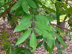 Die wechselständig angeordneten Laubblätter sind in Blattstiel sowie Blattspreite gegliedert und insgesamt mindestens 15 bis 30 Zentimeter lang. Die unpaarig gefiederten Blattspreiten enthalten meist vier oder fünf (selten drei oder sechs) Fiederpaare. Die Stiele der eiförmigen bis -lanzettlichen oder lanzettlichen bis verkehrt-eilanzettlich Fiederblättchen sind kürzer als 5 Millimeter. Die etwas ledrigen, kahlen und ganzrandigen Fiederblättchen sind oft asymmetrisch, 6 bis 15 Zentimeter lang und 2,5 bis 5 Zentimeter breit. Sie sind oberseits glänzend und an der Spitze rundspitzig bis spitz, an der Basis sind sie spitz bis keilförmig. Die Keimblätter (Kotyledonen) sind dick.[1]