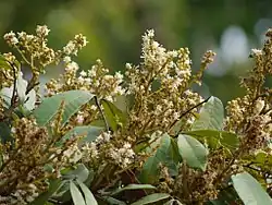Die end- oder achselständigen, großen und rispigen Blütenstände sind stark verzweigt und feinhaarig. Die funktionell eingeschlechtigen, kurz gestielten Blüten sind radiärsymmetrisch mit doppelter Blütenhülle. Die fünf becherförmig verwachsenen, fast ledrigen Kelchblätter sind etwa 2,5 Millimeter lang und auf beiden Seiten bräunlich wollig behaart. Die fünf Kronblätter sind milchig-weiß und fast gleich lang wie die Kelchblätter. In den männlichen Blüten sind acht Staubblätter mit haarigen Staubfäden oder bei den funktional weiblichen Blüten, kurze Staminodien vorhanden.[1] Der Fruchtknoten ist oberständig, die Narbe ist zwei- bis dreilappig. Es ist ein Diskus vorhanden. Bei den männlichen Blüten kann ein Pistillode ausgebildet sein.[2]