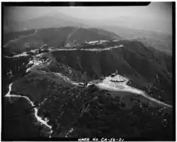 Luftaufnahme aus Westen von den Anlagen der Los Pinetos Nike Site. Das Feuer brach südlich davon durch eine defekte Stromleitung aus und bedrohte anfangs auch die Anlagen der Kaserne. Soldaten entfernten auf Ersuchen der Forstverwaltung die Vegetation im Vorfeld und verbrachten die Raketen in die unterirdischen Schächte. (1988)