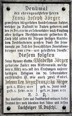 Denkmal des ehrengeachteten Herrn Franz Joseph Jörger, gewesenen bürgerlichen Handelsmann dahier, welcher zu Rastadt in Baden geboren, und den 29. Dez. 1831 im 69. Lebensjahre nach Empfang aller heiligen Sterbesakramente gestorben ist. Noch jetzt zollen die Bürger hiesigen Marktes dem Verblichenen großen Dank für seine damals zur Zeit des französischen Revolutionskrieges von 1796 bis 1815 geleisteten Dienste. Diesem folgten Seine theuere Gattin Elisabetha Jörger, geborene Sailer von Mittenwald, welche den 11. März 1856 mit den Trostungen unserer heiligen Religion im 70. Lebensjahre entschlafen ist, wie auch zwei Enkel, Johann Bap. Jörger, geb. 6. März 1829, gest. 3. Febr. 1835 und Franziska Jörger, geb. 16. Juni und gest. 19. Juni 1831. R.I.P. Aus kindlicher Liebe und Dankbarkeit widmen dieses Denkmal ihre noch lebenden drei Söhne und dessen Nachfolger M. Duschl.