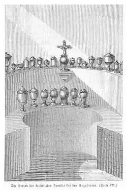 Die Kammer, in die die Herzurnen gestellt wurden, war circa 40 cm tief. Eine eiserne und darüber eine marmorne Platte bildeten den Verschluss.[3] Von diesem alten Sepulchrum gibt die Sakristeichronik der Augustinerkirche folgende Beschreibung: