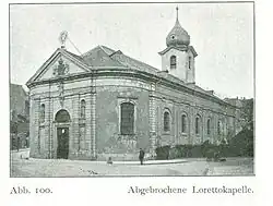 Die Loretokapelle war ein massiver Bau im Stil der toskanischen Renaissance, ursprünglich orientiert an der einfachen Grundform des griechischen Tempels. Die mit vier Pilasterpaaren geordnete Hauptfassade war dabei in drei Fensterachsen gegliedert; über dem umlaufenden Architrav erhob sich ein girlanden- und wappengeschmücktes Tympanon. Bei der Mitte des 18. Jahrhunderts veranlassten Umgestaltung wurde der Hauptfassade eine Vorhalle mit gerundeten Ecken und einer kleineren Giebelfassade in barocken Formen vorgeblendet. Auch das Dach wurde umgestaltet. Der Sakralraum war in drei gleich breite, überwölbte Schiffe untergliedert. Die Gewölbe wurden von schweren Pfeilern getragen. Über der Vierung erhob sich ein massiver, zwiebelgekrönter Vierungsturm.