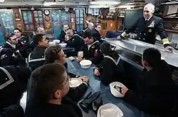 Auf dem mittleren Deck der vorderen Sektion sind sowohl Schlaf- als auch Aufenthaltsräume nach Mannschaften sowie Unteroffizieren und Offizieren getrennt. Die drei Messen (wiederum getrennt nach Dienstgradgruppen) dienen als Speisesaal, Aufenthaltsraum mit Fernseher mit Stellplätzen für Getränke- und Verkaufsautomaten. Die Bordküche serviert zu jeder Wachablösung warme Mahlzeiten, die auf längeren Patrouillenfahrten aus tiefgekühlter und getrockneter Nahrung zubereitet werden. Für kürzere Missionen können in einem der beiden Kühlräume frische Nahrungsmitteln mitgeführt werden.