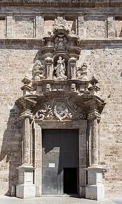 Die Hauptfassade enthält eine zugemauerte Fensterrose der älteren Kirche, die auch „O des Johannes“ genannt wird. Eine Nische des viereckigen HInterbaus der Apsis zum Platz der Seidenbörse hin enthält eine Statuengruppe aus Stuck Virgen del Rosario von Jacopo Bertesi. Das Jesuskind hält die Hand an die Weltkugel. Oben steht ein Uhrturm, und eine Dachlinie trägt die Statuen der beiden Johannes: den Täufer, den Evangelisten, weiter die heiligen Francesco Borgia und Luis Bertrán.[2]