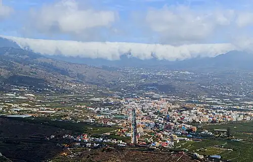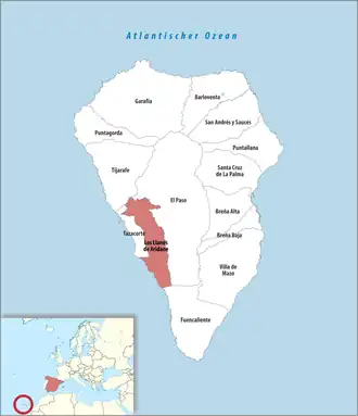 Los Llanos de Aridane ist eine der 14 Gemeinden auf der Kanarischen Insel La Palma. Sie liegt überwiegend im Valle de Aridane, einem in Nordsüdrichtung ausgedehnten Plateau zwischen der Küste an der Westküste und der Vulkankette Cumbre Vieja in der Mitte der Insel. Die Nord-Süd-Ausdehnung der Gemeinde beträgt etwa 14 km. Im Norden befindet sich ihr gleichnamiger Hauptort mit der Gemeindeverwaltung. Dieser liegt auf einer Höhe von 325 Metern über dem Meeresspiegel[4] und ist flächenmäßig einer der kleinsten der Gemeinde.
