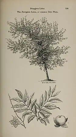 Plinius der Ältere nannte verschiedene Pflanzenarten mit Namen Lotus: drei baumartige, zwei krautartige und einen stängelartigen Lotus.[6] Mit dem Lotusbaum könnte entweder die Lotuspflaume, der Zürgelbaum (Celtis australis L.) oder die Lotus-Brustbeere (Ziziphus lotus (L.) Lam.) gemeint sein, denn alle drei Arten kommen in Italien vor. Von einer Art bemerkte Plinius, dass das Holz schwarz und für die Anfertigung von Flöten sehr gesucht sei. Das spricht für die Lotuspflaume, deren Holz dunkel wie Ebenholz ist.