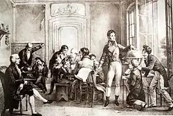 - Am 28. Juli 1835 sollte der König bei einer Truppenparade durch eine von Joseph Fieschi konstruierte und eingesetzte Höllenmaschine getötet werden. Der König wurde leicht verletzt, zwölf Personen aus seinem Gefolge starben. Weitere Tote und Verletzte gab es unter den Zuschauern auf dem Pariser Boulevard du Temple.[5] Fieschi und zwei Mitverschwörer wurden mit der Guillotine geköpft. Durch die Septembergesetze wurde am 9. September 1835 die Zensur wieder eingeführt und die Strafen für alle Pressevergehen wurden drastisch erhöht, da der oppositionellen Presse vorgeworfen wurde, das Klima für den Anschlag bereitet zu haben.