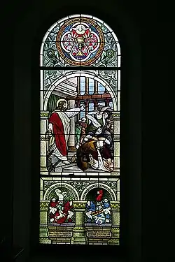 - Reformierte Kirche Regensberg: Rundbogenfenster mit Darstellung der Vertreibung aus dem Tempel, eines Tondo mit Abendmahlsymbolen und Pfingsttaube sowie den Stifterwappen, 1911.