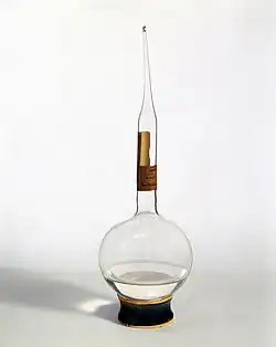 - Nach dem Vorbild von Eugène Chevreul[55] ließ er Flaschen mit einem schwanenhalsartigen Hals anfertigen, füllte sie mit Zuckerwasser, Urin oder Milch und kochte den Inhalt auf. (Unabhängig von Pasteur hatte Hermann Hoffmann ebenfalls 1860 dieses Verfahren beschrieben.[56]) Obwohl die Flaschen eine offene Verbindung zur Luft hatten, blieb der Inhalt steril. In Kontrollflaschen, deren Inhalt nicht aufgekocht worden war, bildete sich in kurzer Zeit ein Schimmelrasen. Brach Pasteur die Schwanenhälse ab, so bildete sich auch in den steril gebliebenen Flaschen Schimmel oder der Inhalt fing an zu gären. Anscheinend waren Mikroorganismen von oben in die Flaschen hineingeschwebt, was der lang ausgezogene Schwanenhals zuvor verhindert hatte.