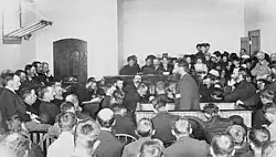 Die Staatsanwälte nahmen ihre Arbeit am 1. Juli auf und sechs Tage später teilten sie Riel mit, dass er wegen Hochverrats angeklagt werde. Am 14. Juli traf Riel erstmals drei seiner Anwälte: Es waren dies François-Xavier Lemieux[42] und Charles Fitzpatrick[43], zwei Juristen aus Québec, die der Association Nationale pour la Défense des Prisonniers Métis („Nationale Gesellschaft für die Verteidigung von Métis-Gefangenen“) angehörten, sowie Thomas Cooke Johnstone[44] aus Ontario, der sich vor kurzem in Regina niedergelassen hatte.