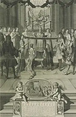 Im Juni 1684[8] vereinbarten Ludwig XIV. und der Herzog von Enghien, Henri Jules de Bourbon, ihre beiden Kinder Louise Françoise und Louis miteinander zu vermählen. In Anbetracht des noch kindlichen Alters der Braut wurde diese Absprache jedoch vorerst noch geheim gehalten und erst im April des darauffolgenden Jahres publik gemacht.[9] Die offizielle Verlobung fand am 23. Juli 1685 im Salon des kleinen königlichen Appartements in Versailles in Anwesenheit des gesamten Hofes statt. Anschließend gab es eine Fahrt auf dem Grand Canal im Schlosspark, ein festliches Souper im Trianon und ein abschließendes Feuerwerk.[10] Die Heirat fand mit großem Pomp auf darauffolgenden Tag in der Schlosskapelle von Versailles statt. Ihre Zeremonie wurde von Pierre IV. du Cambout de Coislin, dem Bischof von Orléans, geleitet.[11] Die Braut war zu jener Zeit gerade einmal zwölf Jahre alt, der Bräutigam fünf Jahre älter. Der König zeigte sich spendabel und stattete seine Tochter mit einer Mitgift in Höhe von einer Million Livres aus. Dazu kamen Schmuck im Wert von 100.000 Livres und eine ebenso hohe monatliche Pension für jeden der Brautleute.[11] Das Paar machte während der offiziellen Zeremonie, nach der die beiden für mehrere Monate wieder getrennt wurden, einen derart komischen Eindruck, dass sich Louis-François de Bouchet, marquis de Sourches zu der Äußerung hinreißen ließ, dass die Heirat dieser beiden Marionetten lächerlich wirke.[11]