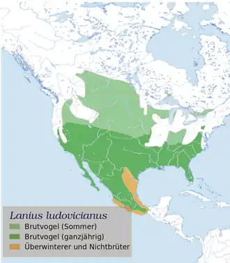 - Lanius ludovicianus migrans, selten bis sehr selten in Mittleren Westen der und dem Nordosten der USA, in Kanada als gefährdet eingestuft.[3]