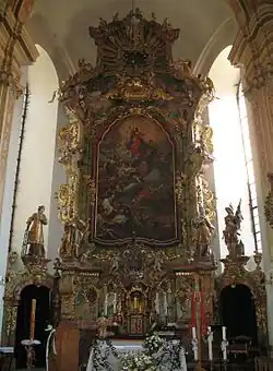 - Die Pfarrkirche St. Anna (Kościół Św. Anny) diente ursprünglich als Friedhofskapelle und war dem Hl. Kreuz geweiht. Sie wurde 1696–98 unter Abt Dominicus Geyer errichtet und wird dem Stiftsbaumeister Martin Urban zugeschrieben. Der Hauptaltar von 1803 enthält eine Figur der hl. Anna selbdritt aus dem 1. Viertel des 16. Jahrhunderts. Die Seitenaltäre stammen aus dem Jahr 1702, die Skulpturen auf den Konsolen aus dem Anfang des 18. Jahrhunderts.