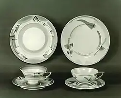 - Frühstücksgedeck, um 1925, Ausführung: Kunstwerkstätte Lucia Wünsche, Weimar, Porzellan mit Aufglasurbemalung, Bröhan-Museum Berlin (seit 1986)
