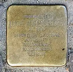 Am 6. Mai 2022 wurde in der Bleibtreustr. 17, im Berliner Bezirk Charlottenburg, ein Stolperstein für Lucie Adelsberger verlegt. In dem Haus, in dem sie die letzten anderthalb Jahre vor ihrer Deportation nach Auschwitz im Mai 1943 wohnte, hat heute u. a. der Landesverband Berlin-Brandenburg des Ärzteverbands Marburger Bund seinen Sitz.