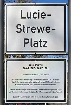 - ↑ Steinhoff/Wojahn,Uhde: Beschluss BNr:84/V. (PDF) Platz nach Lucie Strewe benennen. In: berlin.de Das offizielle Hauptstadtportal. Bezirksverordnetenversammlung Steglitz-Zehlendorf von Berlin, 7. März 2017, archiviert vom am 30. Dezember 2018; abgerufen am 30. Dezember 2018.
