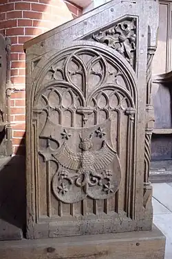 Zur gotischen Erstausstattung des Hochchors gehören die zweisitzigen Grafenstühle. Es wird vermutet, dass sie gleich nach Fertigstellung des Chors von Graf Ulrich I. in Auftrag gegeben wurden. An den Seitenwänden der Pulte sind sie mit geschnitzten Wappen verziert. Das nördliche trägt den Jungfrauenadler der Cirksena, das südliche ein Wappen mit einem Einhorn, dem Symbol für Christus, aber auch der Jungfräulichkeit, im Wappenschild.[37] Beide sind holzsichtig. In der Mitte zwischen den Grafenstühlen steht ein Dreisitz, dessen Pult an seiner Südseite zwei christliche Symbole zeigt: einen Pelikan, der für die sich aufopfernde Liebe und für Jesus Christus steht und Jona im Maul eines Fisches, dessen Geschichte im Christentum als Symbol für den Tod und die Auferstehung Jesu gilt.