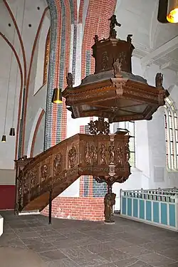 Die barocke Kanzel wurde 1712 geschaffen und die alte schlichte Kanzel von 1588 an die Ardorfer Kirche verschenkt. Die neue ist ein Werk des aus Norden stammenden und damals in Hamburg, später in den Niederlanden wirkenden Orgelbauers Rudolf Garrels, eines Schülers Arp Schnitgers. Im Kontrakt für die Kanzel und an der Innenseite der Eingangstür findet sich die ältere Schreibweise „Redolph Garrelts“. Die Kanzel ist holzsichtig und zeigt wichtige Stationen der biblischen Heilsgeschichte.[30] Sie wird von Mose gestützt, der die beiden Gesetzestafeln mit den Zehn Geboten in den Händen hält. Am Treppenaufgang und dem Kanzelkorb befinden sich 18 weitere geschnitzte Figuren des niederländischen Bildhauers und Holzschnitzers Jan de Rijk. Zentrale Figur ist Jesus, dargestellt als Salvator Mundi mit der Unterschrift I. S. MUNDI. Ihm zur Seite stehen rechts Johannes der Täufer und die vier Evangelisten, abwechselnd unter einem Rundbogen in den Feldern und an den Ecken hervortretend. Links wird Christus flankiert von Petrus, Andreas, Jakobus dem Älteren und Thomas. Die Reihe findet am Treppenaufgang ihre Fortsetzung mit sechs Figuren (von oben nach unten): die Apostel Jakobus der Jüngere, Judas Thaddäus, Simon, Matthias und Paulus sowie schließlich Martin Luther. Die Kanzel verfügt über zwölf Stufen und eine Innentür zum Kanzelkorb, auf der Philippus und Bartholomäus dargestellt sind.[31] Die Figuren stehen auf Konsolen, die mit ihren Namen versehen sind. Fast alle sind auch durch ihre Attribute gekennzeichnet. Thomas hielt lange Zeit den Pilgerstab seines Nachbarn Jakobus (inzwischen korrigiert), an dem oben ein kleiner Beutel mit Schnalle und eine Kürbisflasche angebracht sind. Die abgebrochenen Finger des Jakobus können den Stab nämlich nicht mehr sicher halten. Ungewöhnlich sind der Beutel und das umgekehrte Kreuz als Attribute bei Thaddäus.[32] Auf dem Türrahmen zur Kanzeltreppe ist Mose in gebückter Haltung dargestellt, der Gottes Befehl gehorcht und angesichts des heiligen Ortes seine Schuhe auszieht (vgl. Ex 3,5 ).