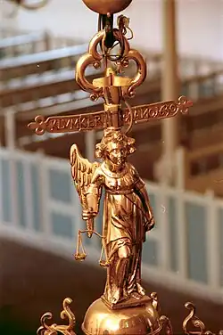 Der übergroße, turmartig aufragende Kanzeldeckel geht deutlich auf niederländische Vorbilder zurück. Er ist an den Ecken mit sechs Frauen- und Männerfiguren versehen, deren Marterwerkzeuge die Kreuzigung in Erinnerung rufen. Die fünf Reliefs an der Laterne weisen auf die Auferstehung Jesu Christi, die Engel darüber auf die Ewigkeit hin.[30] Auf dem mittleren Relief ist der Auferstandene mit Siegesfahne dargestellt, flankiert von zwei Emmaus-Jüngern und außen je einem Engel.[6] Der bekrönende Engel ganz oben bläst eine Trompete und hält in der anderen Hand ein Buch mit den Worten Das ewige Evangelium.[6] An der Unterseite des Schalldeckels wurde dem Kontrakt gemäß nicht, wie damals üblich, eine Taube, sondern eine Rose angebracht.