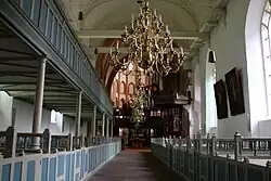 Das Gestühl und die Emporen wurden erst nach der Reformation eingebaut. Die Türchen des ebenerdigen Kastengestühls sind vereinzelt noch mit Wappen, Hausmarken, Monogrammen und Jahreszahlen versehen, die vom einstigen Privatbesitz zeugen. Die geschlossene, schlichte und nur an den Rückenlehnen mit Reihen von gedrechselten Holzstäben verzierte Bauweise sorgte in früheren Zeiten dafür, die Wärme einfacher Fußwärmer, in denen ein Stück Torf glühte, zu halten. Um 1690 wurde das Sitzplatzangebot durch den Bau der großen Emporen im Langschiff erweitert.[29]