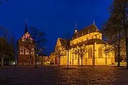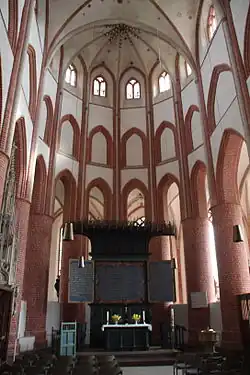 Es folgen das Querhaus (1445 wiederaufgebaut und dabei vergrößert) mit einer Breite von rund 32 Metern und einer Länge von etwa 12 Metern sowie der gotische Chor (um 1455 fertig geworden). Die beiden Querarme verfügen an der westlichen und an der Giebelseite über je ein großes spitzbogiges Fenster mit Maßwerk. An der Ostseite schließt sich der eingerückte Umgang des Chors an. Das nördliche Querhaus weist nur im Sockelbereich Backstein auf, ist ansonsten aber mit hellem Tuffstein aufgeführt und im Giebeldreieck mit drei spitzbogigen Blenden verziert. Die unterschiedlichen Baumaterialien an der südlichen Giebelseite unterstreichen die Gliederung in drei Ebenen: Das untere Drittel besteht wie das Giebeldreieck aus roten Backsteinen, während der mittlere Bereich mit dem Maßwerkfenster aus Tuffstein gebildet ist. Das südliche Giebeldreieck wird von fünf schmalen Blendnischen verziert, in denen Sandsteinstatuetten auf Konsolen stehen. Beide Giebelseiten werden durch reich profilierte korbbogige Portale geprägt, über denen Blendnischen mit profilierten Spitzbogen angebracht sind.[19]