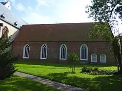 In der ersten Hälfte des 13. Jahrhunderts (Datierungsversuche seit 1945 schwanken zwischen 1200/1220[7] und 1230/1250[8]) wurde die rechteckige Einraumkirche aus Backstein erbaut, die mit einer Länge von 41 und einer Breite von 13 Metern etwas größere Dimensionen als die benachbarte Stadtkirche hatte. Dies wird als Ausdruck der Konkurrenzsituation gedeutet, in der sich Stadt- und Landeskirche befanden.[9] Im Osten war dieser Bau mit einer halbrunden Apsis aus Tuffstein abgeschlossen, was zu der Zeit nichts Ungewöhnliches war. Wegen dogmatisch-ideologischer Bedenken gegen von Menschenhand hergestellte Steine hielt man nämlich Natursteine für den Altarraum damals noch für angemessener.[10] Der Bau hatte je zwei Eingänge an der Nord- und Südseite, kleine Rundbogenfenster und eine flache Holzbalkendecke.[11] Die Ausstattung wird, wie zu der Zeit üblich, nur aus einem Taufstein und einem gemauerten Altartisch bestanden haben, denn Kanzel, Altaraufsatz, Leuchter und andere Ausstattungsgegenstände waren damals noch unüblich. Es gab auch noch kein festes Gestühl. Die Gläubigen mussten stehend der heiligen Messe beiwohnen.[12]