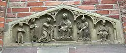 Über dem Nordportal des Querhauses befindet sich außen ein Relief. Es stellt die Anbetung der Könige dar, die auf der linken Seite zu sehen sind. Zentrales Element ist Maria mit dem Kind. Rechts von ihr sitzt Josef mit einem Judenhut als Kopfbedeckung und neben ihm ein Heiliger, vermutlich der Apostel Andreas.[6]
