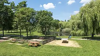 Neben dem Laaerbergbad befindet sich steil abfallend am Südhang des Laaer Berges der große Volkspark Laaerberg, der als Teil des südlichen Wiener Wald- und Wiesengürtels ab dem Jahr 1932 und im Zuge des Badbaues besonders bis 1959 angelegt wurde. Der naturnahe Park besitzt in seiner Mitte den großen Volksparkteich. Im Gelände liegen Kinderspielplätze und eine öffentliche WC-Anlage. In der Nähe des Teichs steht ein Obelisk von Helmut Leherb mit Reliefschmuck auf zwei Seiten, der Tag und Nacht symbolisiert.