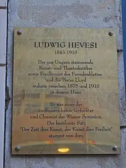 Kleine Chronik. (…) Ludwig Hevesi. In: Neue Freie Presse, Morgenblatt. Nr. 16353/1910, 2. März 1910, S. 8 Mitte. (online bei ANNO). - ↑ Gedenktafelweihe und Symposion zu Ehren des ungarischen Kunstkritikers Ludwig Hevesi. In: meinbezirk.at, abgerufen am 13. Februar 2014.