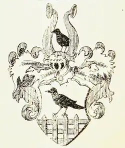 Das Wappen zeigt auf Silber einen roten Lattenzaun, auf dem ein Rabe sitzt. Auf dem Helm mit rot-silbernen Decken der Rabe zwischen zwei roten Büffelhörnern.