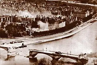 Während des Zweiten Weltkriegs wurde die Ludwigsbrücke bei einem Tieffliegerangriff am Abend des 4. Februar 1945 erheblich beschädigt.[6] Am 2. April 1945 gegen 11:30 Uhr wurde sie schließlich als zweite der drei damals im Bereich der Würzburger Altstadt existierenden Mainbrücken von deutschen Truppen gesprengt, um die Einnahme der Stadt durch die Amerikaner zu verhindern. Dennoch konnten amerikanische Soldaten am folgenden Tag auf das rechte Mainufer übersetzen und dort einen Brückenkopf errichten, so dass die Löwenbrücke am 4. April wieder passierbar[7] war. Der zerstörte mittlere Brückenbogen wurde notdürftig mit einer Bailey-Brücke[8] repariert, um den nachrückenden US-Truppen die Überquerung des Flusses zu ermöglichen.[9]