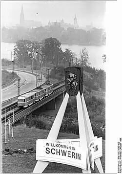 - Westseite: Betonskulptur Willkommen in Schwerin von 1977