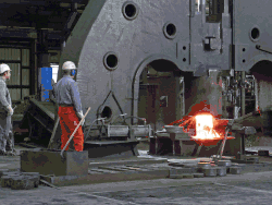 Schmieden eines Rohlings zum Radreifen im Bochumer Verein (2010)
