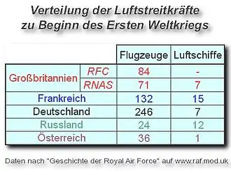 Alle Großmächte bauten sich Lufteinheiten auf, die aber noch Teil von Heer oder Marine waren. Siehe z. B. Royal Flying Corps (RFC), Französische Luftwaffe, k.u.k. Luftfahrtruppen, USAF, Fliegertruppe des Russischen Reichs.