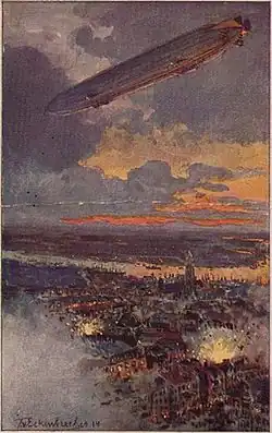 Als erste Städte wurden am 6. und 24. August 1914 Lüttich und Antwerpen von einem deutschen Zeppelin bombardiert. Der erste deutsche Bombenabwurf auf britischen Boden erfolgte durch den Fliegerleutnant Hans von Prondzynski[13] am 24. Dezember in Dover. Die von ihm abgeworfene Bombe verfehlte das anvisierte Ziel Dover Castle und landete im Pfarrgarten von St. James.[14] Eine danach aufgestiegene britische Maschine konnte den Angreifer nicht mehr ausfindig machen.[15] Am 19. Januar 1915 wurden die ostenglischen Städte Great Yarmouth und King’s Lynn in Norfolk von den Zeppelinen L3 und L4 bombardiert.[16] Am 31. Mai wurde der erste Bombenangriff auf London geflogen.