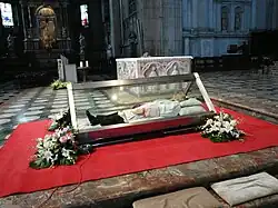 Die Ganzkörperreliquie des hl. Luigi Guanella im Dom von Como im Oktober 2012, dem einjährigen Jubiläum seiner Heiligsprechung