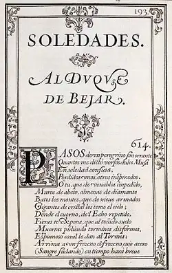 - Soledades (entstanden 1613/14, erschienen 1636): Vier Teile über die Einsamkeit der Felder, Ufer, Wälder und des Ödlandes waren geplant, nur zwei sind erschienen, berühmt für die schönen Naturschilderungen