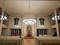 Das Kruzifix stammt von Gerhard Schreiter. Die Fenster des Ostflügels zeigen Verglasungen nach Entwürfen von Ludwig Peter Kowalski, zu deren Stiftern Heinrich Mendelssohn gehört.