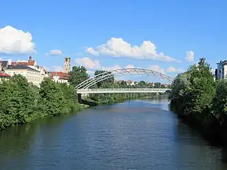 Nach dem Krieg wurde eine Betonbrücke gebaut, die ebenso wie die angrenzende Straße Luitpoldbrücke genannt wurde.[9] Sie wies 2004 so erhebliche Schäden auf, dass eine Instandsetzung wirtschaftlich nicht vertretbar war.[10] Im Rahmen des Brückenprojekt 2010 genannten Verfahrens[11] wurden sechs mögliche Brückenvarianten vorgeschlagen.[12] Am 29. September 2004 entschied sich der Stadtrat für die Variante mit Stabbogen und Dreigurtträger.[13] Die alte Brücke wurde im April 2005 abgebrochen.[14] Von 2005 bis 2006 wurde die neue Luitpoldbrücke gebaut.[2]