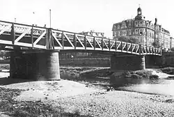 1932 wurde sie durch einen Neubau ersetzt[8], der, wie alle Bamberger Brücken über den Main-Donau-Kanal, wenige Tage vor dem Ende des Zweiten Weltkriegs gesprengt wurde, um den Vormarsch der US-Armee aufzuhalten.