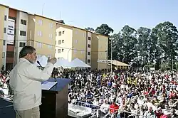 Im Juni 2006 gab Lula die Kandidatur für eine zweite Amtszeit bekannt. Gegen ihn trat der Sozialdemokrat Geraldo Alckmin an. Beim ersten Wahlgang der Präsidentschaftswahl am 1. Oktober 2006 verfehlte Lula mit 48,6 % der Stimmen nur knapp die absolute Mehrheit. Er musste sich in einem 2. Wahlgang seinem Herausforderer, Geraldo Alckmin, stellen. Die meisten Stimmen gewann Lula im Nordosten Brasiliens, wo die in seiner Amtszeit eingeführten Sozialprogramme erste Wirkung zeigten. In seiner Heimatregion hingegen musste Lula herbe Verluste einstecken.[14] In der Stichwahl am 29. Oktober 2006 wurde Lula im Amt bestätigt. Mit 61 % lag er deutlich vor seinem Herausforderer Alckmin (39 %).[15]