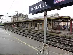Der Bahnhof Lunéville wurde 1852 zeitgleich mit dem Abschnitt Nancy–Sarrebourg der Bahnstrecke Paris–Strasbourg eröffnet. Im Jahr 1864 ging eine Zweigstrecke nach Saint-Dié-des-Vosges in Betrieb. Auf dem Bahnhofsvorplatz endeten die Personenzüge der meterspurigen Bahnstrecken nach Einville (ab 1902) sowie nach Blâmont und Badonviller (ab 1911); der Verkehr auf diesen beiden Strecken wurde 1942 eingestellt.