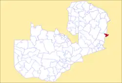 Der Distrikt befindet etwa 610 Kilometer nordöstlich von Lusaka. Er liegt im Osten auf über 1400 m und fällt nach Westen auf etwa 1000 m ab. Die Ostgrenze zu Malawi entspricht der Einzugsgebietsgrenze zwischen Luangwa und Malawisee. Ein Teil der Südgrenze wird von dem Fluss Luampamba und dessen Zustrom Matemba gebildet. Die Nordgrenzen bilden zum Teil der Luampamba Nebenfluss Nkanga und der Lundazi der seine Quellen im Distrikt hat.