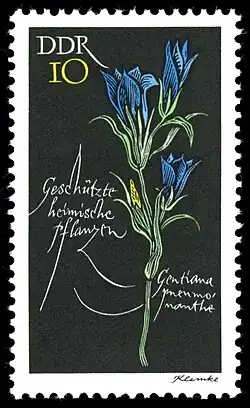 Der Lungen-Enzian war 1980 Blume des Jahres und erschien bereits 1966 auf einer Briefmarke der Serie Geschützte heimische Pflanzen.