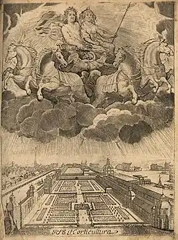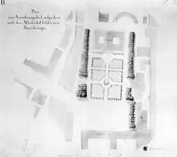 Noch vor Kriegsende ließ Kurfürst Friedrich Wilhelm 1645 den Garten wiederherstellen und durch den Militäringenieur Johann Mauritz und den Hofgärtner Michael Hanff nach dem Vorbild der niederländischen Gärten anlegen. Das Gelände fiel von Südwest nach Nordost in Terrassen leicht ab und trägt seit 1646 den Namen Lustgarten. Großen Einfluss auf die Anlage hatte der Schlossbaumeister Johann Gregor Memhardt, der seine Vorstellungen 1652 in einem Plan für die Gestaltung Berlins, dem Memhardt-Plan, vorlegte.[2] Darin sah er einen dreigeteilten Garten vor, der nur teilweise verwirklicht wurde. Neben dem eigentlichen Lustgarten, der ein Arboretum, Volieren, Hecken, Statuen, Skulpturen und Laubengänge sowie ein Lusthaus vorsah, entwarf Memhardt einen sich westlich anschließenden Wassergarten mit Springbrunnen, Fontäne und Wasserspielen sowie einen Küchengarten, der auch exotische Pflanzen und Gewürze beherbergen sollte. Das Lusthaus im niederländischen Stil hatte Memhardt schon 1650 erbaut, im Untergeschoss enthielt es eine künstliche Grotte. Für die 1649 aus den Niederlanden eingeführten und erstmals hier angepflanzten Kartoffeln wurde 1652 das Pomeranzenhaus errichtet, in dem neben Kartoffeln auch Tomaten als Zierpflanzen gezogen wurden. Es waren die ersten Kartoffeln, die in Preußen kultiviert wurden.[3][4][5] Durch einen Defekt im Heizsystem brannte das Gebäude 1655 ab, wurde 1656 neu aufgebaut und 1658 wieder abgerissen, um Platz für Befestigungsanlagen zu schaffen. Im Zug der Fortifikation wurde der Festungsgraben angelegt, der den Lustgarten zerschnitt und den Cöllner Stadtgraben mit der Spree verband. Der dortige Teil des Gartens musste verlegt werden. Der Botaniker und Hofmediziner Johann Sigismund Elsholtz wurde 1657 Gartenmeister und entwickelte die Anlagen in den Folgejahren zum ersten botanischen Garten Berlins. Der für jedermann frei zugängliche Garten war ein beliebter Treffpunkt der Berliner und der erste und älteste Gartenplatz der Stadt. Bis dahin hatte man in Berlin nur Markt-, Kirch- und Exerzierplätze gekannt, wie Bogdan Krieger (1863–1931) schreibt. Im Jahr 1660 wurde auch das Ballhaus, das früher außerhalb der alten Stadtmauern gelegen hatte, an den Rand des Lustgartens verlegt. Es diente für Ballspiele, insbesondere eine Frühform des Tennisspiels (Jeu de paume). Ab 1685 wurde die Anlage im Norden durch Johann Arnold Nering um ein in Halbkreis-Form gebautes sogenanntes „Orangerie-Haus“ erweitert.